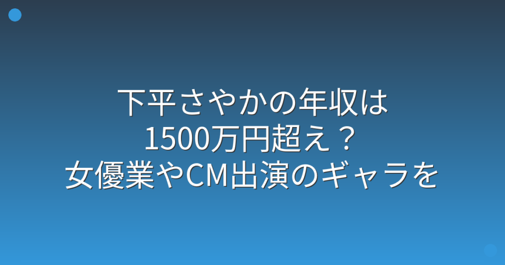 女優として活躍する下平さやかさんの年収が注目を集めていますね。 テレビドラマやCM出演など多方面で活躍する下平さやかさんですが、一体どれくらいの収入を得ているのでしょうか。 そこで今回は、下平さやかさんの年収や収入源について詳しく見ていきま... -