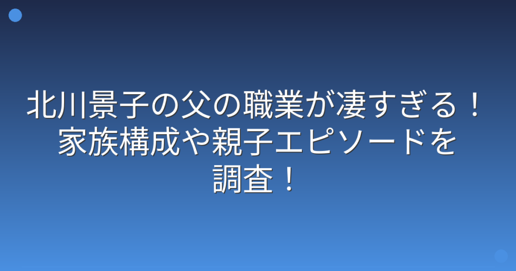 女優として大活躍中の北川景子さんですが、そのご家族、特にお父様について気になっている方も多いのではないでしょうか。 美しく才能溢れる北川景子さんを育てたお父様とは、一体どんな方なのでしょうか。 そこで今回は、北川景子さんの父の職業や家族構... -