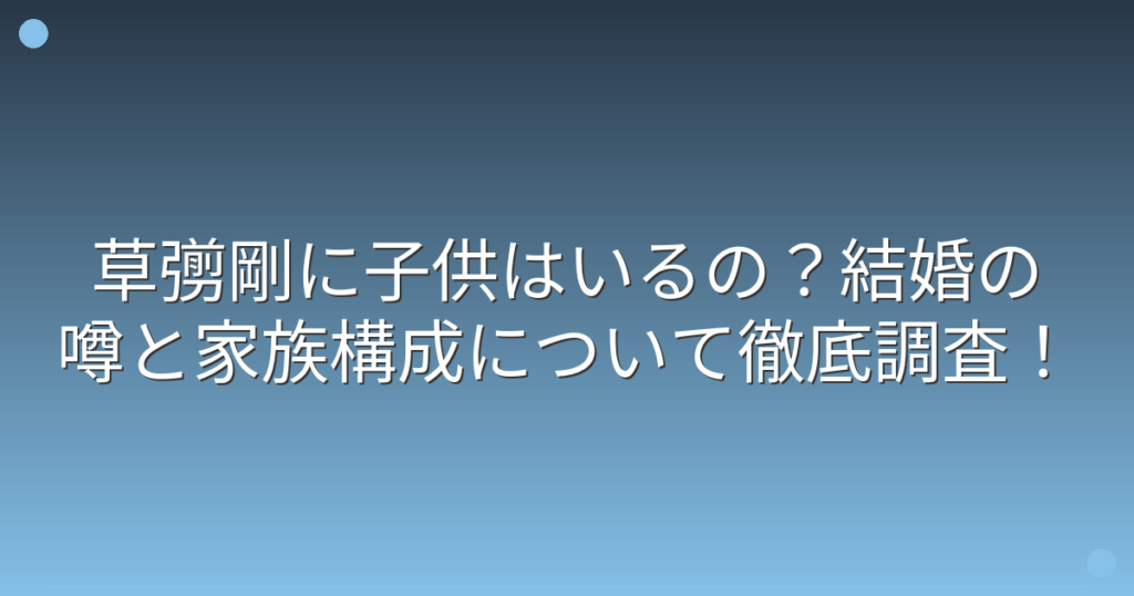 SMAP元メンバーで俳優の草彅剛さんについて、子供や家族に関する話題がファンの間で注目されていますね。 長年芸能界で活躍されている草彅剛さんですが、プライベートについては謎に包まれている部分も多く、結婚や子供の有無について気になっている方も多... -