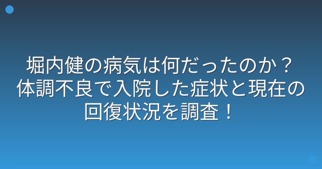 お笑いコンビ・ネプチューンのメンバーとして活躍する堀内健さんの病気について、ファンの間で心配の声が上がっていますね。 テレビで見ない日はないほど多忙な堀内健さんですが、過去に体調不良で話題になったことがありました。 そこで今回は、堀内健さ... -