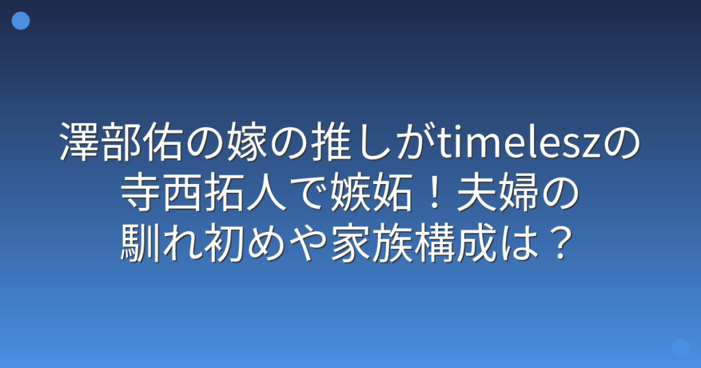 ハライチの澤部佑さんの嫁が話題になっていますね。 2025年12月1日放送の「timeleszファミリア」で、澤部さんの嫁の推しがtimeleszの寺西拓人さんであることが明かされ、澤部さんが「悔しい!」と嫉妬する姿がスタジオを爆笑の渦に包みました。 そこで今回... -