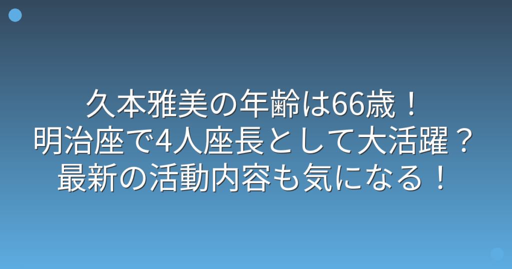 最近、明治座の舞台で座長を務めるなど、精力的な活動を続ける久本雅美さんが話題になっていますね。 久本雅美さんの年齢や現在の活動内容について、多くの方が興味を持たれているようです。 そこで今回は、久本雅美さんの年齢や最新の活動内容について、...