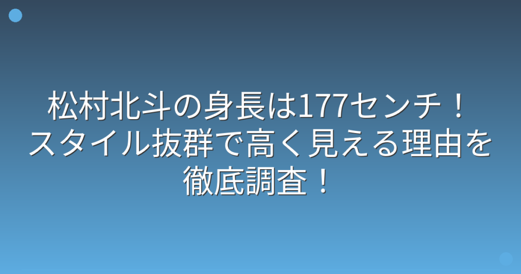 SixTONESのメンバーとして活躍し、俳優としても注目を集める松村北斗さんの身長が話題になっていますね。 テレビや雑誌で見るたびに「スタイルが良い」「実際より高く見える」という声が多く聞かれます。 そこで今回は、松村北斗さんの身長や体型、スタイ...