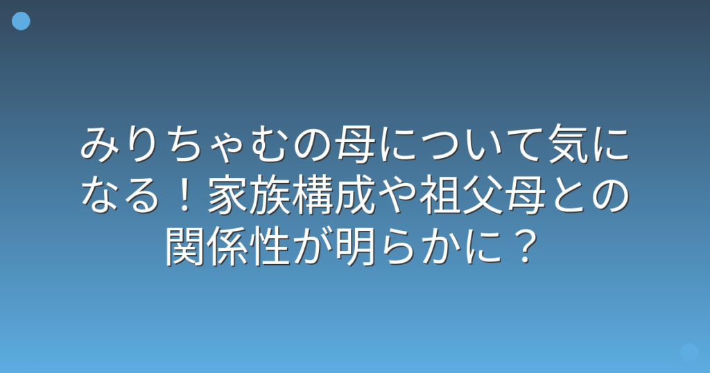 最近、23歳のモデル・みりちゃむさんの活躍が話題になっていますね。 特に、SNSでの祖父母との仲睦まじい写真投稿が注目を集めています。 そこで今回は、みりちゃむさんの母親や家族関係について、詳しく見ていきましょう! 【みりちゃむの母親と家族構成...
