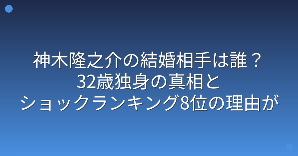 人気俳優の神木隆之介さんの結婚について、ファンの間で大きな関心が集まっています。 特に、「結婚したらショックな男性芸能人ランキング」で8位にランクインしたことで、さらに注目が集まっているようです。 そこで今回は、神木隆之介さんの結婚相手や、...