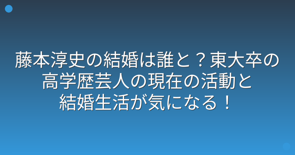元お笑いコンビ「田畑藤本」のメンバーで、東京大学出身の高学歴芸人として知られる藤本淳史さんについて、結婚に関する情報が話題になっていますね。 藤本さんは2020年末にコンビを解散し、現在はピン芸人として活動していますが、プライベートな部分につ...